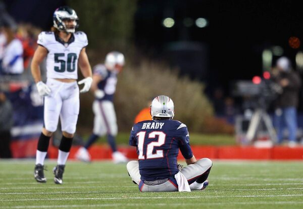 New England Patriots’ Tom Brady led his team’s rally with three passing touchdowns and one rushing TD, but the Pats were unable to score on their final drive of the game, a shocking 35-28 loss to the Philadelphia Eagles on Dec. 6.Jim Rogash/Getty Images