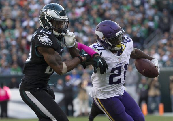 Jerick McKinnon of the Minnesota Vikings stiff-arms Rodney McLeod of the Philadelphia Eagles in the third quarter on Oct. 23, 2016.Mitchell Leff/Getty Images