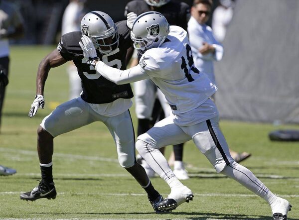 Oakland Raiders defensive back Chimdi Chekwa, left, and wide receiver Mike Davis, right, take part in a blocking drill during their NFL football training camp Sunday, July 27, 2014, in Napa, Calif.Eric Risberg/The Associated Press