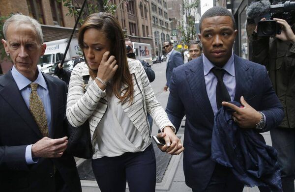 Former Baltimore Ravens NFL running back Ray Rice and his wife Janay arrive for a hearing at a New York City office building November 5, 2014. Rice is making his case on Wednesday to return to the field after the National Football League indefinitely suspended him from the game for claims of domestic violence.MIKE SEGAR/Reuters