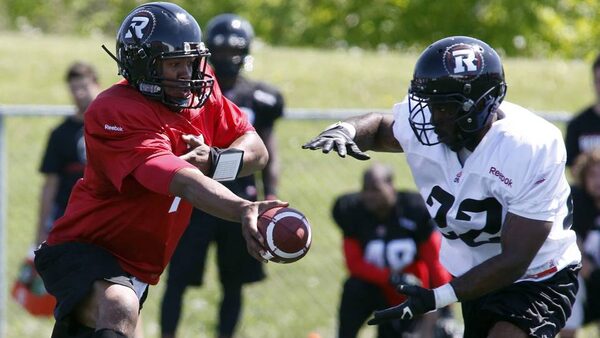 Ottawa Redblacks quarterback Henry Burris hands off the ball to Eric O'Neal at the first day of CFL training camp at Keith Harris Stadium in Ottawa on Sunday, June 1, 2014.The Canadian Press