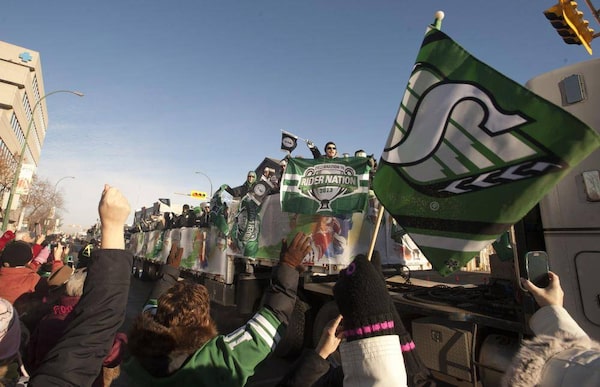 Fans cheer as the Saskatchewan Roughriders float passes them during the Grey Cup parade on Tuesday November 26, 2013 in Regina. The Saskatchewan Roughriders defeated the Hamilton Tiger-Cats 45-23 in the 101st CFL Grey Cup.Liam Richards/The Canadian Press