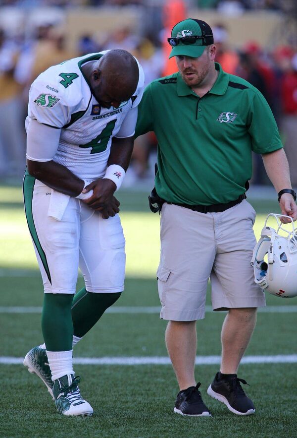 Saskatchewan Roughriders' Darian Durant leaves the field after getting hurt while playing against the Winnipeg Blue Bombers' during second half CFL football action at Investors Group Field in Winnipeg, Sunday, September 7, 2014.Trevor Hagan/The Canadian Press