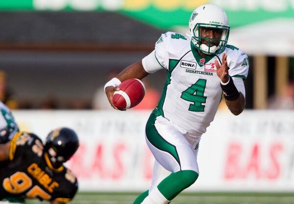 Saskatchewan Roughriders' quarterback Darian Durant runs the ball against the Hamilton Tiger-Cats during first half CFL action at Ivor Wynne Stadium in Hamilton, Ont., Friday, June 29, 2012.Geoff Robins/The Canadian Press