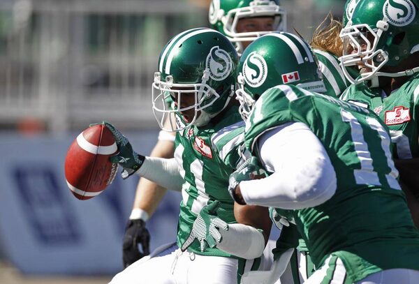 Saskatchewan Roughriders safety Tyron Brackenridge (L) celebrates his touchdown with team mate Odell Willis (11) during play against the Winnipeg Blue Bombers in the first half of their CFL football game in Regina, Saskatchewan September 2, 2012.DAVID STOBBE/Reuters
