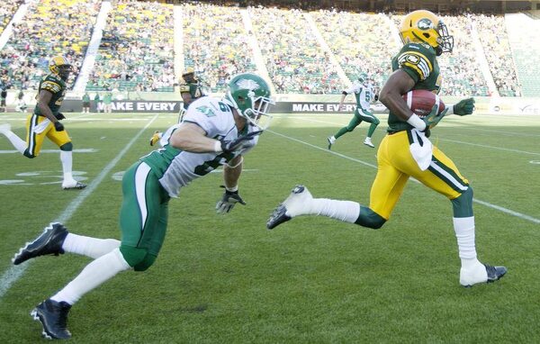 Edmonton went up 7-3 with three minutes to play in the opening quarter when Don Oramasionwu popped a ball loose from Riders receiver Taj Smith.