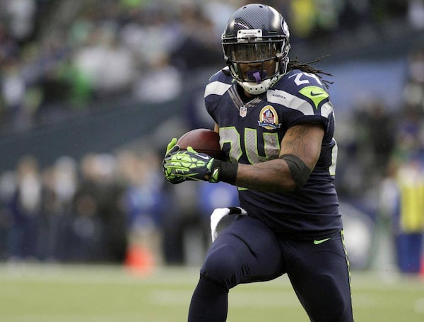 Seattle Seahawks quarterback Marshawn Lynch runs with the football during the first quarter of their NFL game against the Arizona Cardinals in Seattle, Washington, December 9, 2012.ROBERT SORBO/Reuters