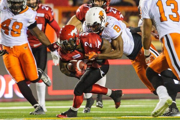Jock Sanders of the Calgary Stampeders runs with the ball against Bo Lokombo of the BC LionsDerek Leung/Getty Images
