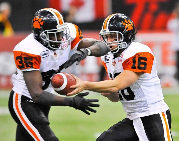 B.C. Lions' QB Buck Pierce hands off the ball to teammate Martell Mallett in this 2009 photoSam Leung/The Canadian Press