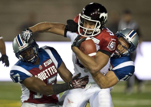 Calgary Stampeders Jon Cornish is taken down by Montreal Alouettes cornerback Billy Parker, left, and Chip Cox during fourth quarter CFL action Friday, July 12, 2013 in Montreal.Paul Chiasson/The Canadian Press