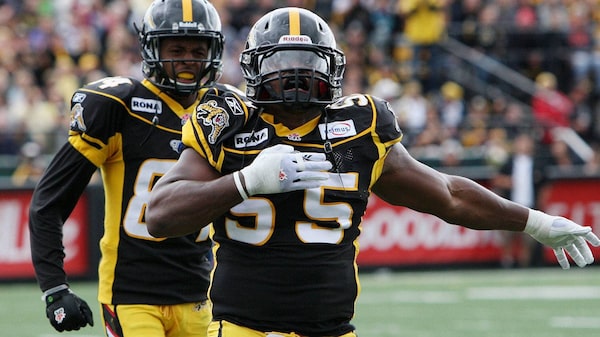 Hamilton Tiger-Cats Stevie Baggs celebrates a big defensive play during first-half. THE CANADIAN PRESS/Dave ChidleyDave Chidley/The Canadian Press