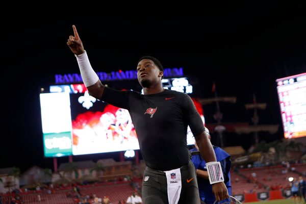 Quarterback Jameis Winston #3 of the Tampa Bay Buccaneers celebrates as he runs off the field following the Buccaneers' 14-5 win over the Seattle Seahawks during an NFL game on November 27, 2016 at Raymond James Stadium in Tampa, Florida.Brian Blanco/Getty Images