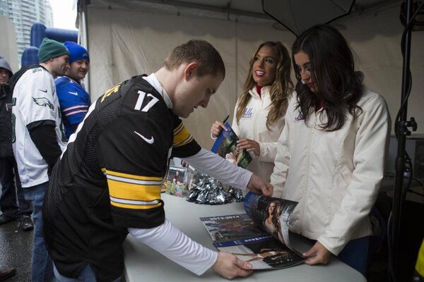 Bills cheerleaders, Amber (right) and Olivia (left) speak with fans during the Buffalo Bills street party at Front Street and John Street prior to the Buffalo Bills vs. Atlanta Falcons NFL game at the Rogers Centre in Toronto, Ontario.PHILIP CHEUNG/The Globe and Mail