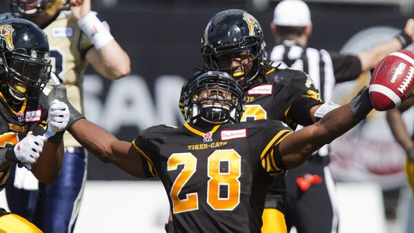 Hamilton Tiger-Cats' Jamall Johnson, centre, celebrates his interception with teammates Simoni Lawrence, left, and Courtney Stephen during fourth quarter CFL action as the Tiger-Cats take on the Winnipeg Blue Bombers in Guelph, Ont., Saturday, August 24, 2013.