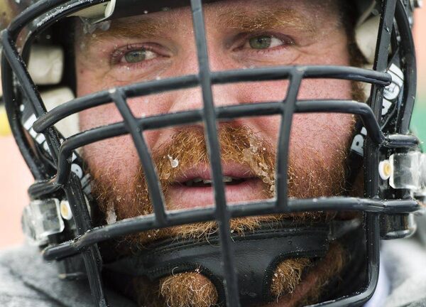 Hamilton Tiger-Cats offensive linemen Tim O'Neill has ice crystals in his mustache as he takes part in practice before the upcoming 101st CFL Grey Cup against the Saskatchewan Roughriders in Regina on Wednesday, Nov. 20, 2013.Nathan Denette/The Canadian Press