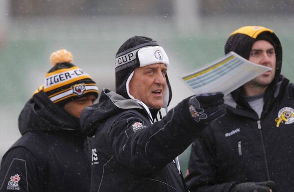 Hamilton Tiger-Cats' head coach Kent Austin, centre, talks to his staff in the extreme cold during team practice in Regina, November 20, 2013.TODD KOROL/Reuters