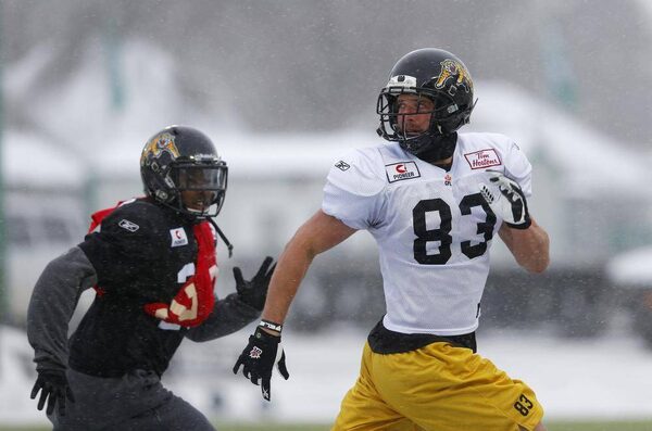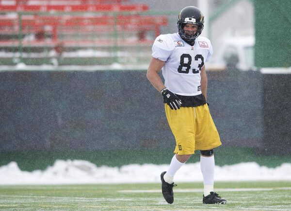 Hamilton Tiger-Cats wide receiver Andy Fantuz, takes part in practice before the up coming 101st CFL Grey Cup against the Saskatchewan Roughriders in Regina on Wednesday, Nov. 20, 2013.Nathan Denette/The Canadian Press
