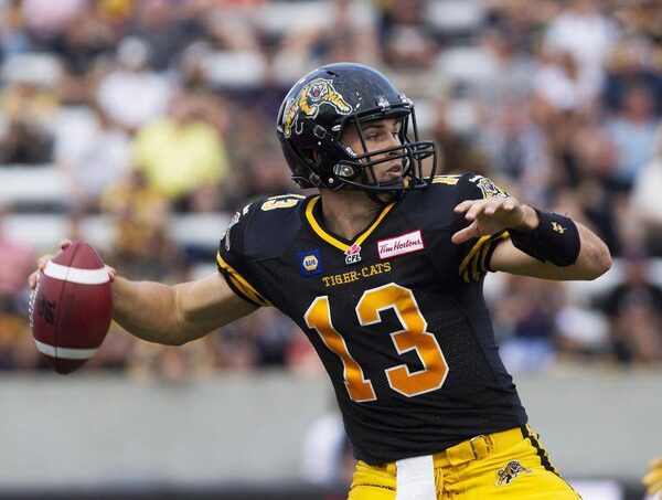 Hamilton Tiger-Cats quarterback Dan LeFevour looks to make a pass during their home opener against the Ottawa RedBlacks in CFL action in Hamilton, Ont., Saturday, July 26, 2014.Aaron Lynett/The Canadian Press