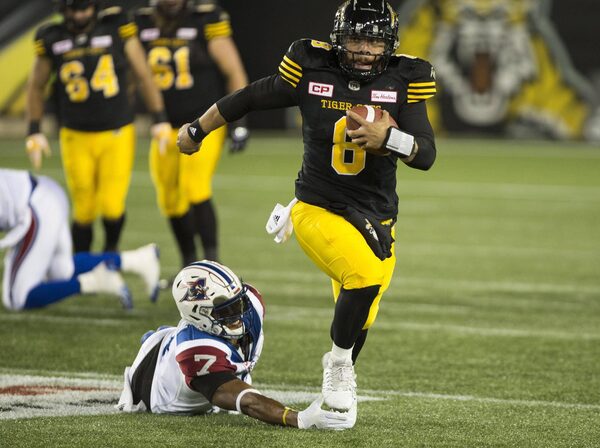 Hamilton Tiger-Cats quarterback Jeremiah Masoli (8) scrambles while chased by Montreal Alouettes defensive end John Bowman (7) during first half CFL football action in Hamilton, Ont., Friday, Nov. 3, 2017.Peter Power/The Canadian Press