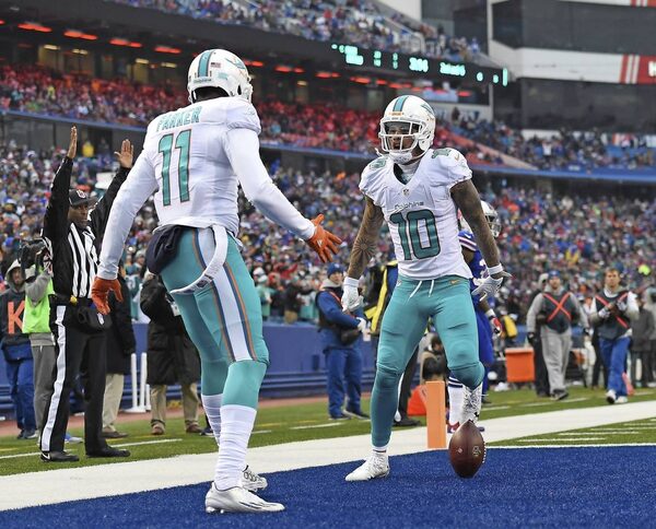 Kenny Stills #10 of the Miami Dolphins celebrates his touchdown with DeVante Parker #11 of the Miami Dolphins during the second half against the Buffalo Bills at New Era Stadium on December 24, 2016 in Orchard Park, New York.Rich Barnes/Getty Images
