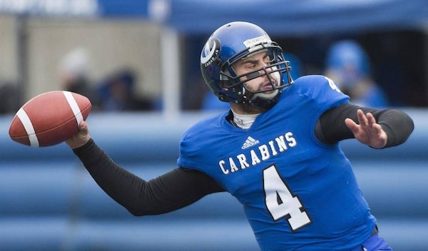 Montreal Carabins quarterback Gabriel Cousineau throws a pass during first half CIS university football semifinal action against the Manitoba Bisons in Montreal, Saturday, November 22, 2014.Graham Hughes/The Canadian Press