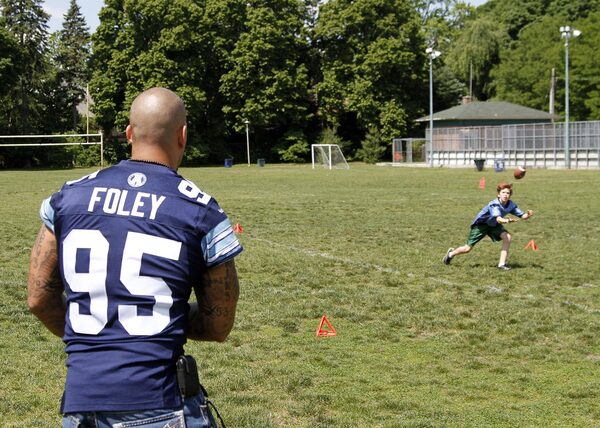 Toronto Argonauts Ricky Foley plays at Rosedale Field with a kid from the neighbourhood who attended the commemoration of the first Grey Cup played at the field in 1909, Toronto May 30 2012.Fernando Morales/The Globe and Mail