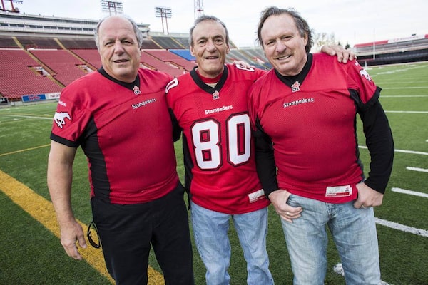 Friday, September 12, 2012 - Calgary, Alberta - The Forzani brothers who all played for the Calgary Stampeders line up for a photo on Friday, September 12, 2012 at McMahon Stadium. (left to right) John, Tom and Joe.Chris Bolin/The Globe and Mail