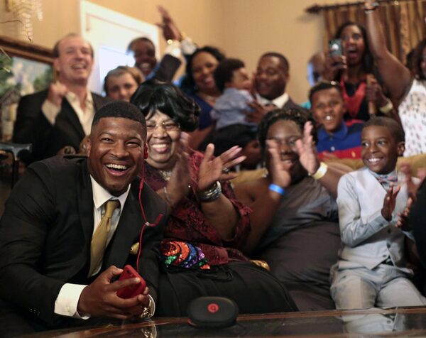 Jameis Winston reacts with his family and friends as he takes the call from the Tampa Bay Buccaneers that they are selecting him as the number one draft pick, Thursday, April 30, 2015, in Bessemer, Ala.Butch Dill/The Associated Press