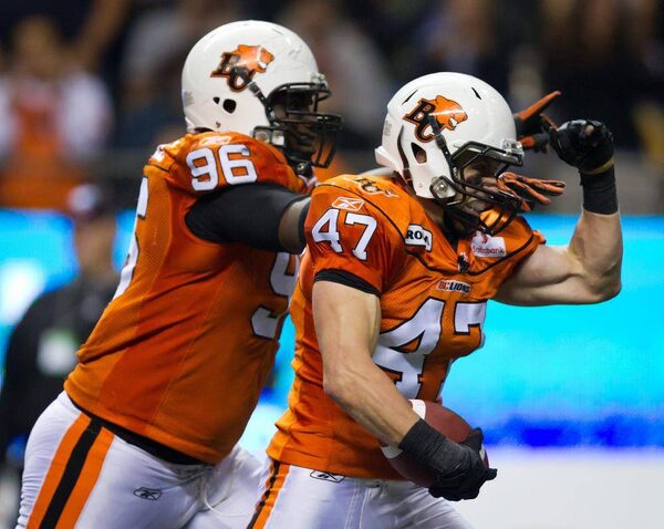 Yurichuk celebrates after recovering a Calgary Stampeders fumble during the second half of a CFL game in Vancouver, B.C., on Saturday October 8, 2011.DARRYL DYCK/The Canadian Press