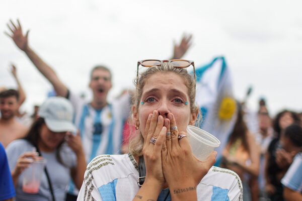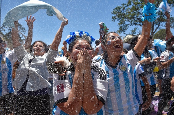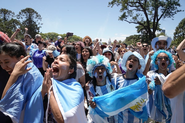Argentina fans react as they watch the 2022 World Cup final on a big outdoor screen in Buenos Aires, Argentina, on Sunday, Dec. 18.Rodrigo Abd/The Associated Press