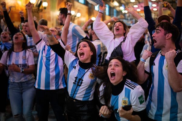 Argentina fans celebrate their first goal in a bar in Madrid, Spain during the 2022 World Cup final soccer match between Argentina and France.Andrea Comas/The Associated Press