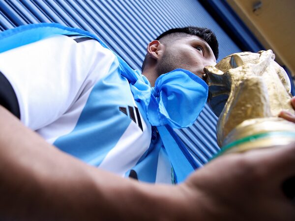 A man kisses a replica of the World Cup trophy as he stands among fellow Argentina fans watching the 2022 World Cup final match in Sao Paulo, Brazil.CARLA CARNIEL/Reuters
