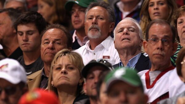 (L-R) Former attorney general of Arizona Grant Woods and U.S. Senator John McCain attend the NHL game between the Chicago Blackhawks and the Phoenix Coyotes at Jobing.com Arena on March 20, 2011 in Glendale, Arizona. The Blackhawks defeated the Coyotes 2-1.Christian Petersen