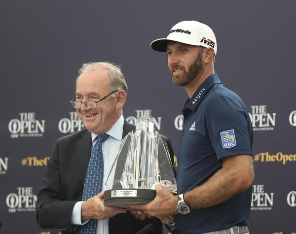 Dustin Johnson, right, receives The Mark H McCormack award for being the leading playing in the Official World Golf rankings for 2018, from OWGR Chairman Peter Dawson during a ceremony ahead of the British Open golf championships at Royal Portrush in Northern Ireland, on July 16, 2019. Dawson says the OWGR has denied the application for LIV Golf to receive ranking points.Jon Super/The Associated Press
