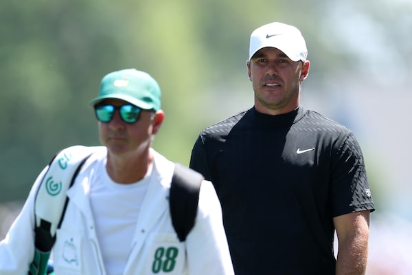 Brooks Koepka of the United States and his caddie Ricky Elliott walk up the first fairway during the final round of the 2026 Masters Tournament at Augusta National Golf Club on Sunday in Augusta, Ga.Andrew Redington/Getty Images