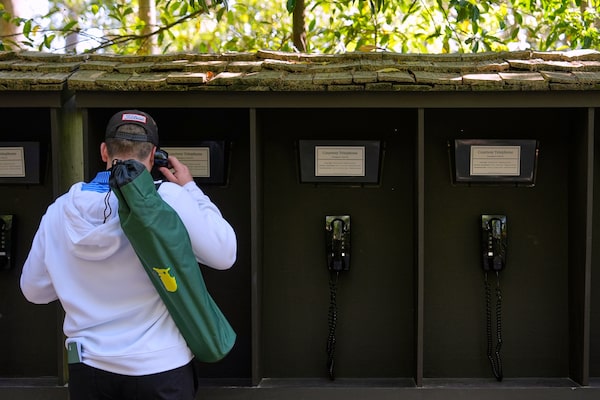 A patron uses the courtesy phones during a practice around at the Masters golf tournament on April 9, 2025, in Augusta, Ga.Julia Demaree Nikhinson/The Canadian Press