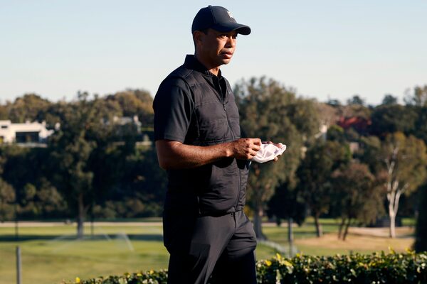 Tiger Woods looks on during the trophy ceremony on the practice green after the final round of the Genesis Invitational golf tournament at Riviera Country Club, Sunday, Feb. 21, 2021, in the Pacific Palisades area of Los Angeles.Ryan Kang/The Associated Press