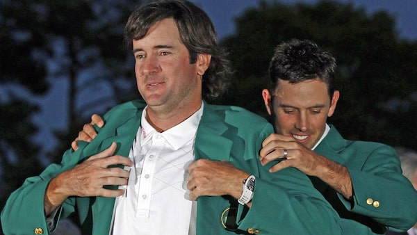 Charl Schwartzel, right, of South Africa, helps Bubba Watson put on the green jacket after winning the Masters golf tournament following a sudden death playoff on the 10th hole Sunday, April 8, 2012, in Augusta, Ga.(AP Photo/Chris O'Meara)Chris O'Meara/The Associated Press