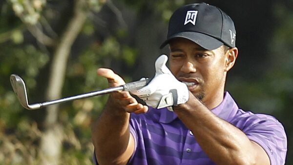 Tiger Woods looks at his club after he bent it hitting out of the rough on the 18th fairway during the first round of the Chevron World Challenge golf tournament in Thousand Oaks, California, December 2, 2010.LUCY NICHOLSON