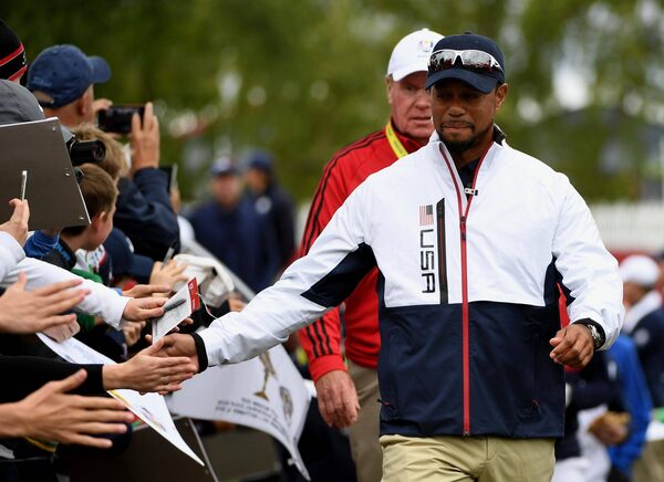 Vice-captain Tiger Woods of the United States high fives fans during practice prior to the 2016 Ryder Cup at Hazeltine National Golf Club on September 28, 2016 in Chaska, Minnesota.Ross Kinnaird/Getty Images