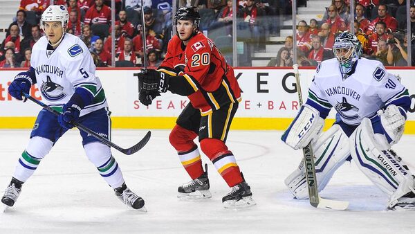 Curtis Glencross of the Calgary Flames looks for an opportunity as Luca Sbisa and Ryan Miller of the Vancouver Canucks defend during an NHL game at Scotiabank Saddledome on October 8, 2014 in Calgary.Getty Images