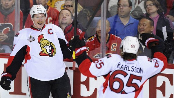 Ottawa Senators' Daniel Alfredsson (L) celebrates his goal with teammate Erik Karlsson during the second period of their NHL hockey game against the Calgary Flames in Calgary, Alberta, November 15, 2011.TODD KOROL/Reuters