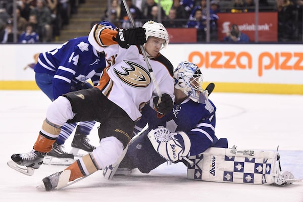 Toronto’s Garret Sparks looks back for the puck as Anaheim’s Jakob Silfverberg collides with him during Thursday’s game at Air Canada Centre in Toronto.Frank Gunn/The Canadian Press