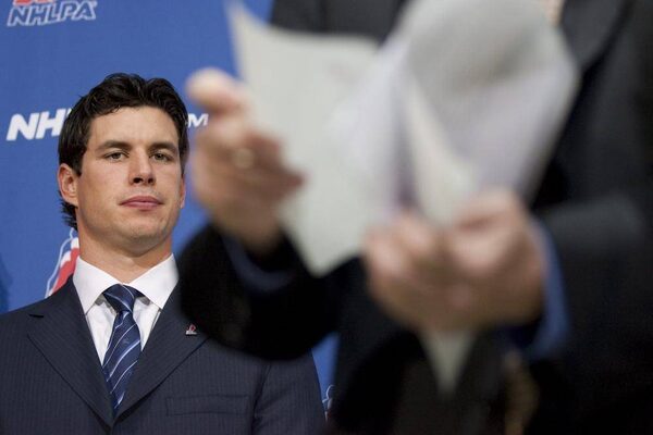 Pittsburgh Penguins Sidney Crosby (left) watches as NHLPA Executive Director Donald Fehr refers to his notes on the NHL's proposal during a news conference following collective bargaining talks in Toronto on Thursday October 18, 2012.Chris Young/The Canadian Press
