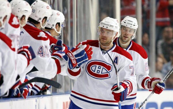 Montreal Canadiens' Andrei Markov (C) and Benoit Pouliot (R) celebrate a goal during the second period of an NHL hockey game against the Tampa Bay Lightning in Tampa, Florida December 30, 2009.MIKE CARLSON/Reuters