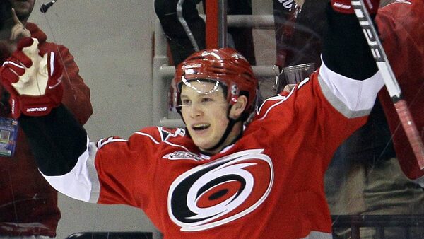 Carolina Hurricanes' Jeff Skinner celebrates his second goal against the Montreal Canadiens during the first period of an NHL hockey game in Raleigh, N.C., Wednesday, March 30, 2011. Carolina won 6-2. (AP Photo/Gerry Broome)Gerry Broome/The Associated Press