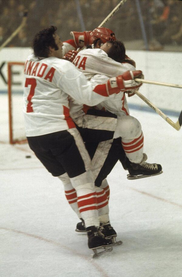 Team Canada celebrates a goal on Sept. 28, 1972, at the Luzhniki Palace of Sports in Moscow, during Game 8 of the Summit Series against the Soviet Union.TASS