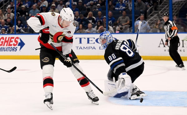 Ottawa Senators captain Brady Tkachuk (7) shoots against Tampa Bay Lightning goaltender Andrei Vasilevskiy (88) during their game on Saturday in Tampa, Fla.Jason Behnken/The Associated Press