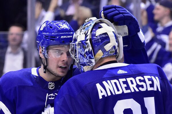 Toronto Maple Leafs centre Auston Matthews and goaltender Frederik Andersen celebrate their Game 6 win on April 23, 2018.Frank Gunn/The Canadian Press