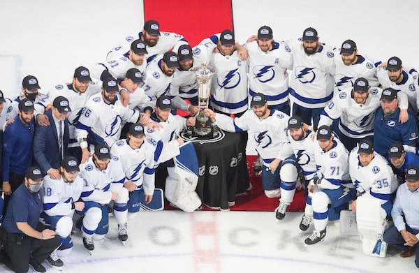 Tampa Bay Lightning pose with the Prince of Wales trophy after defeating the New York Islanders during overtime NHL Eastern Conference final playoff action in Edmonton on Thursday, September 17, 2020.JASON FRANSON/The Canadian Press